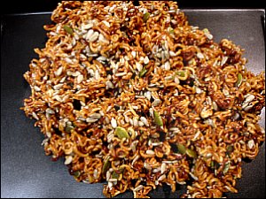After breaking ramen in a ramen bag, pour it into a bowl and mix it with sunflower seed oil, and spread it out in an oven pan and bake it until it is golden. (About 160 degrees and 15 minutes without preheating)