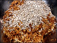 Place golden brown ramen in a bowl and put sesame seeds and sunflower seeds
