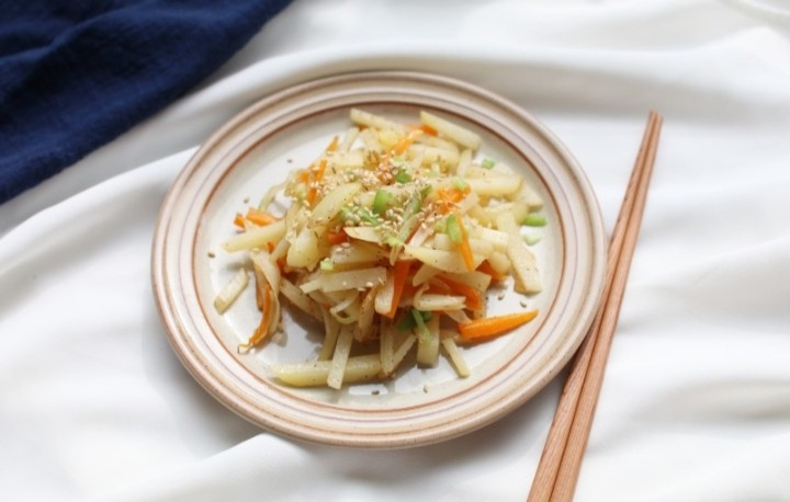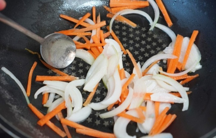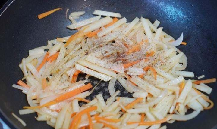 Frelo! Pon aceite comestible, as las zanahorias y las cebollas primero y asalo una vez ms con las verduras de patata en remojo.