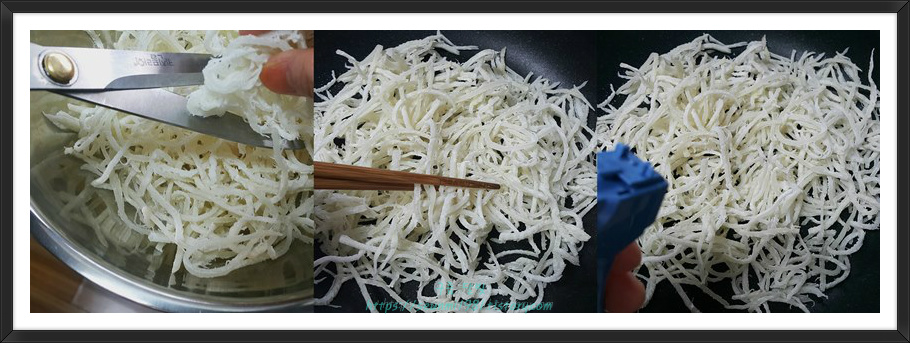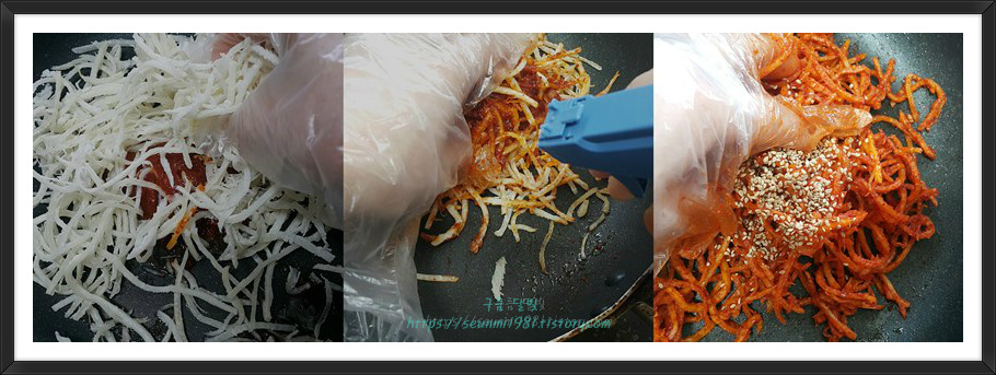 En este momento, utilice un pulverizador para rociar agua. La salsa aglomerada se puede mezclar un poco ms fcilmente Espolvorear el jinmyochae uniformemente mezclado con semillas de ssamo completo.