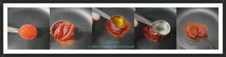 Agregue 3 cucharadas de chile en polvo, 1+1/2 cucharadas de pasta de pimienta roja, 1/2 cucharadas de aceite de ssamo, un poco de jugo de jengibre y 1 cucharada de miel para hacer la salsa.