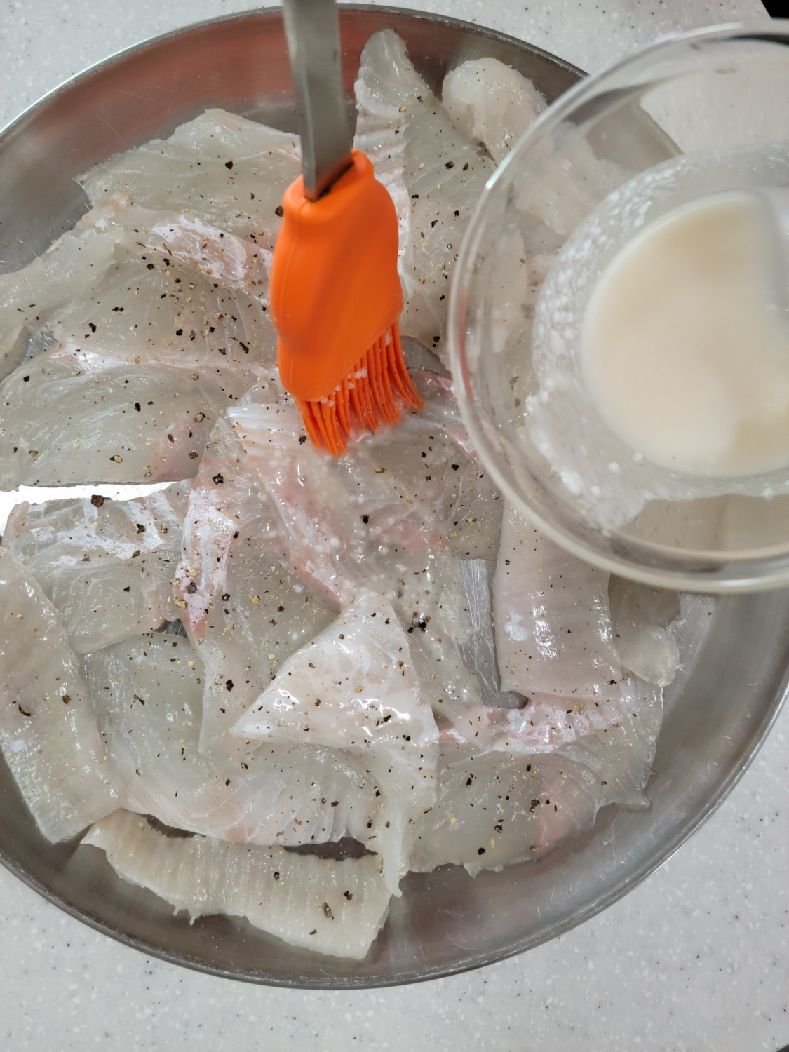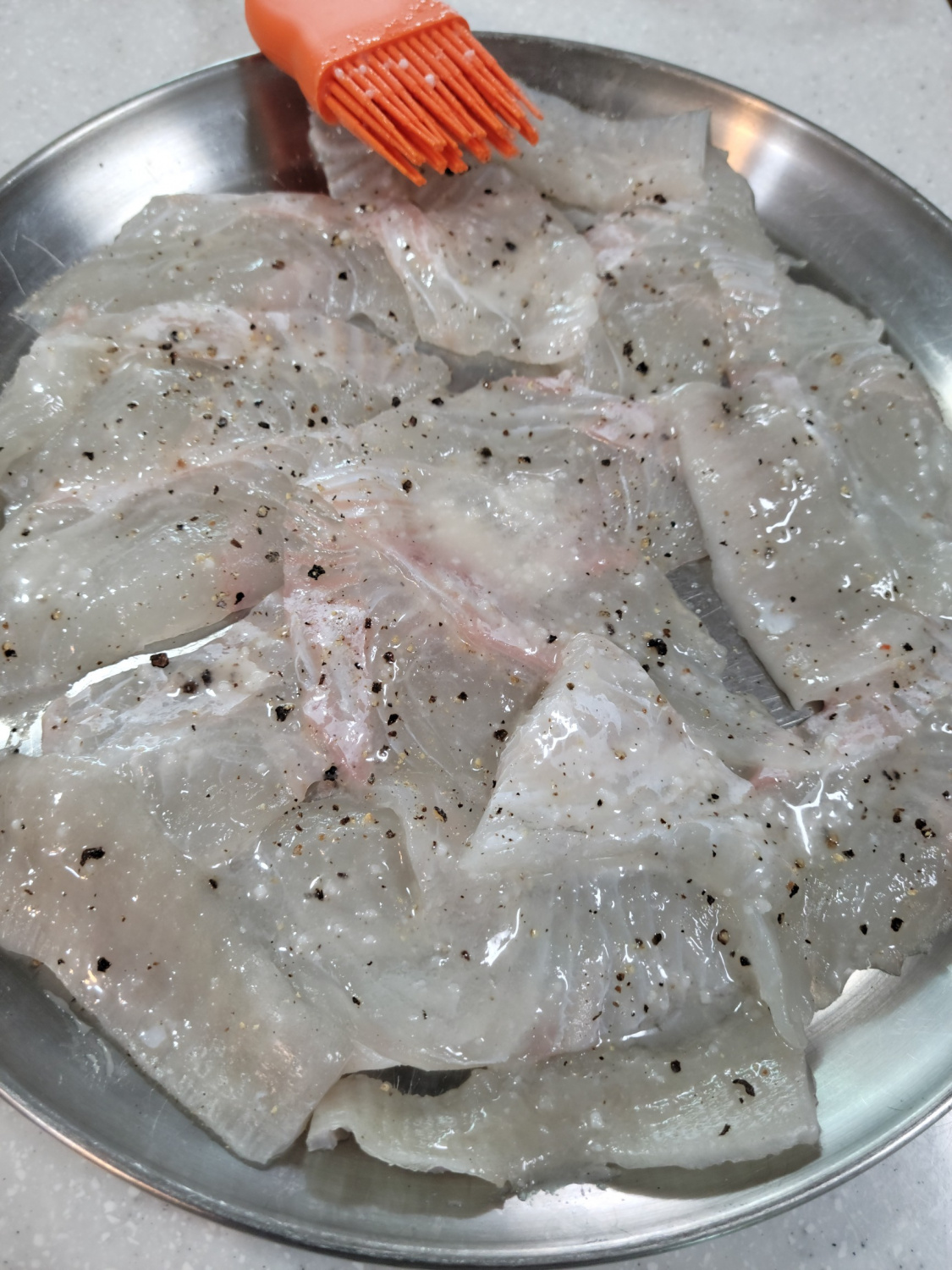 Aplique levadura de sal de un lado a otro sobre la superficie de la grasa de pescado (Puede usar jengibre o jugo de especias).