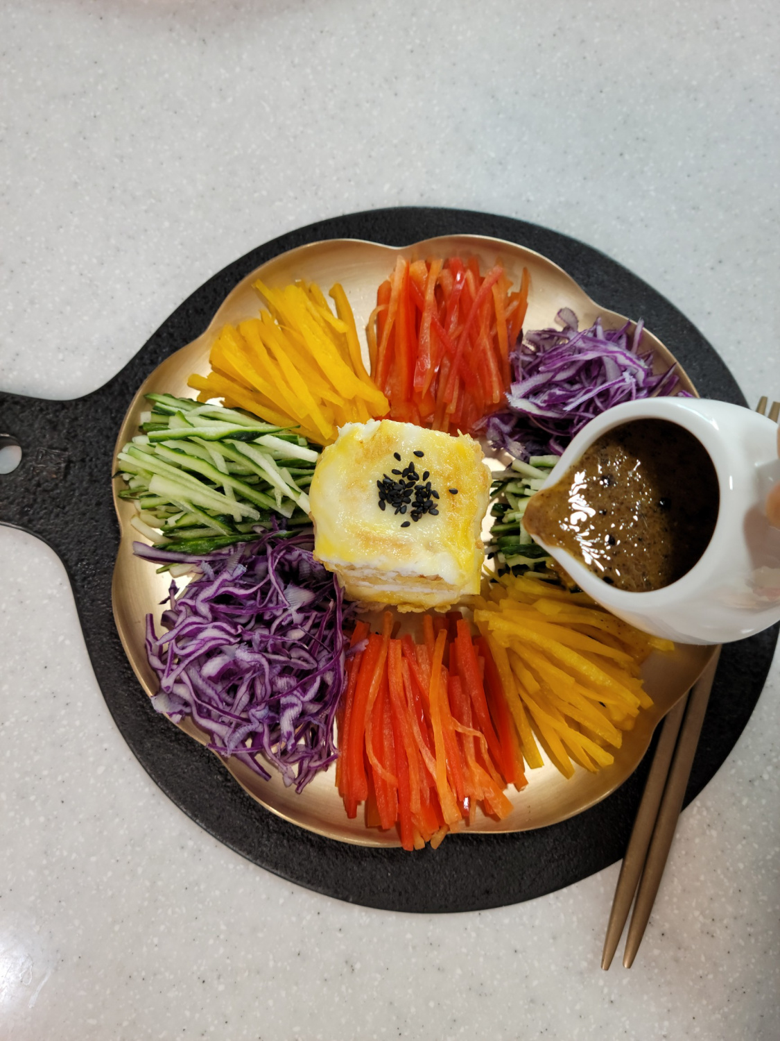 Come deliciosamente poniendo verduras mezcladas en un solo plato de gwanggeop.