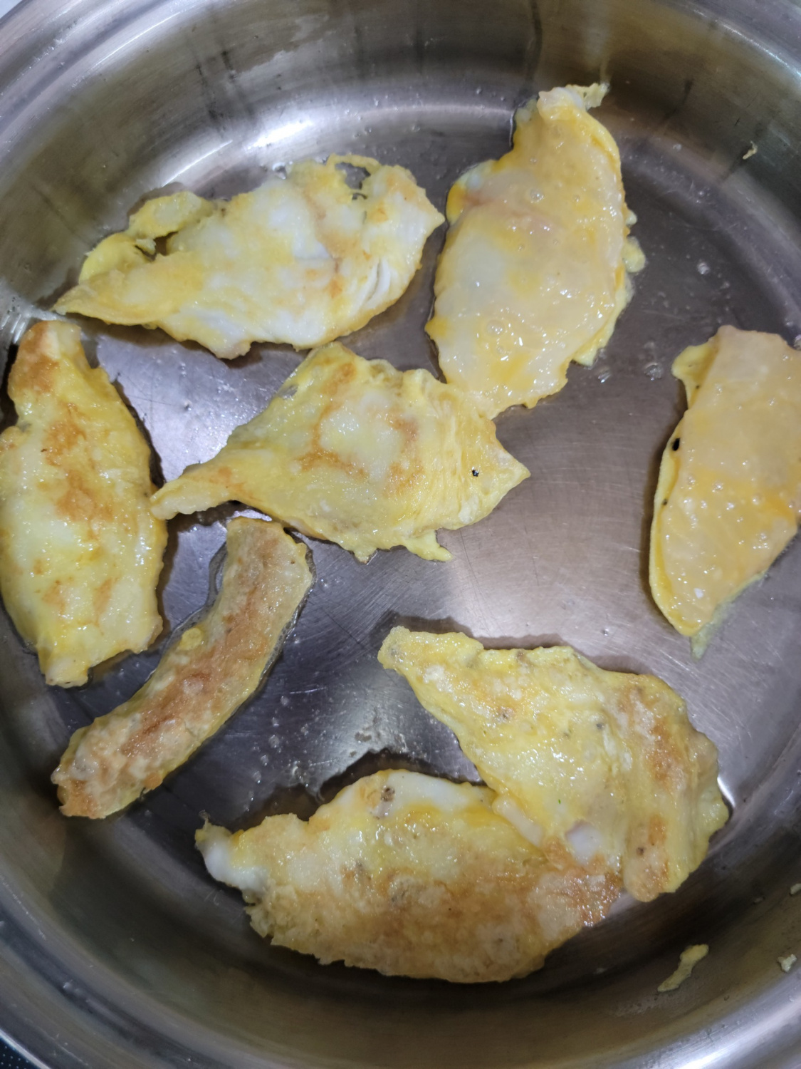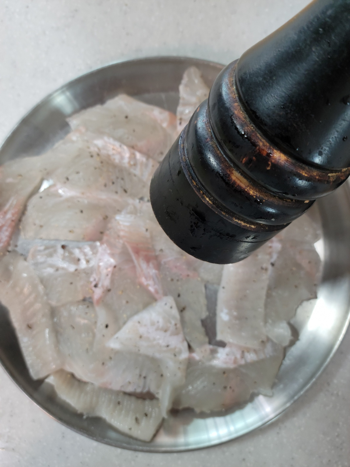 Poner el huevo en salmuera y luego enterrar la carne de pez espada enterrada con almidn.