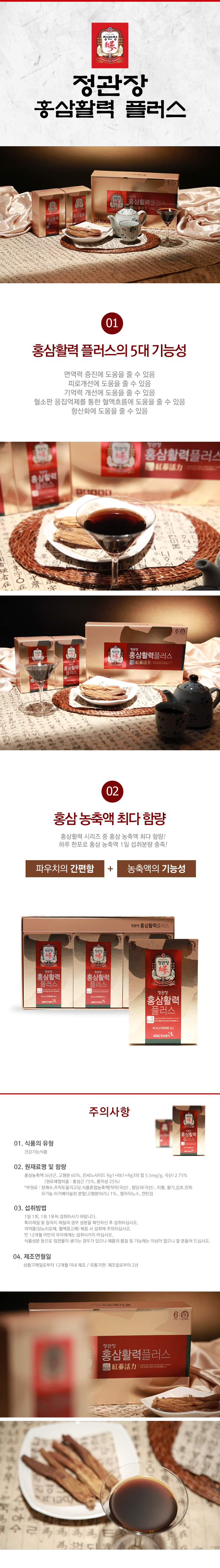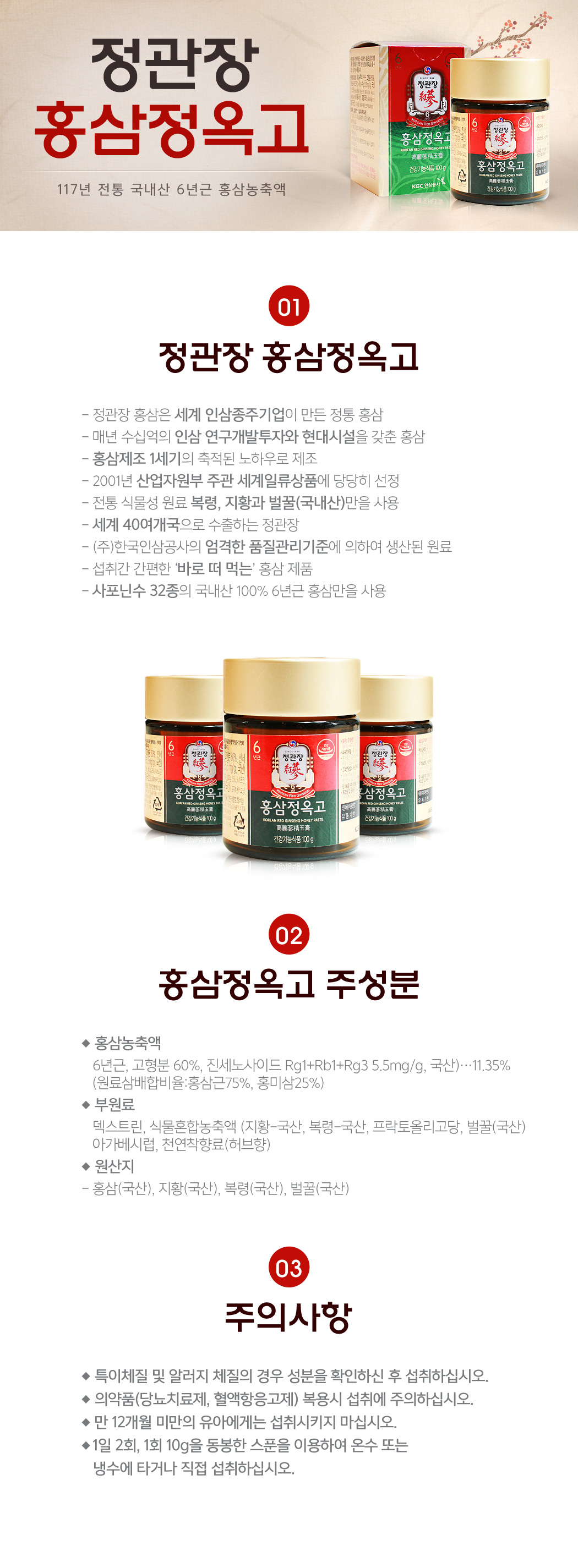 홍삼활력플러스: 홍삼(국산), 작약(국산), 참당귀(국산) 홍삼정옥고: 홍삼(국산), 지황(국산), 복령(국산), 벌꿀(국산)