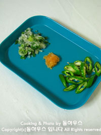 ▶ 청량고추는 어슷썰고, 파는 송송썰어서 2스푼가량, 다진마늘은 1/2스푼가량을 준비하고...