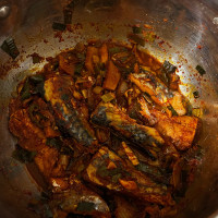 프라이팬에 채 썬 양파를 깔고 간고등어를 올린 후 양념을 끼얹어줍니다. 냄비대신에 스텐레스 프라이팬을 사용했습니다.