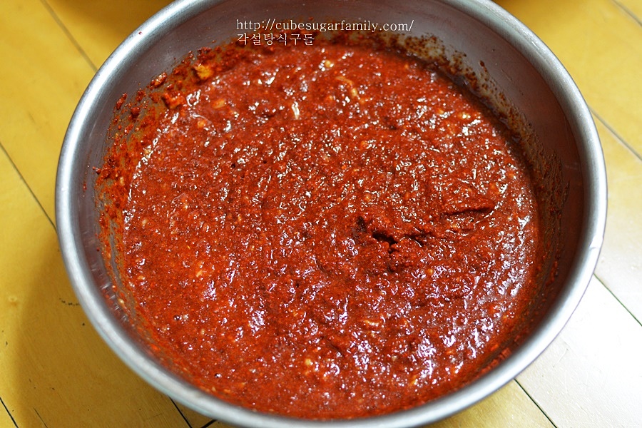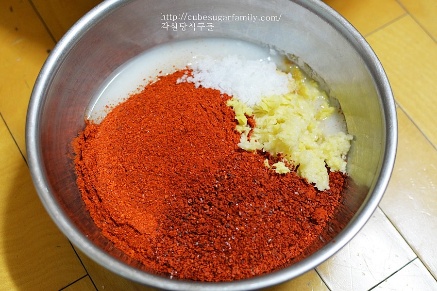생강, 마늘, 고춧가루 2컵, 찹쌀풀 1컵 반, 멸치액젓 1컵반, 소금 2큰술, 설탕 1큰술