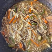 뭐죠??과일이나 다른 특별한것 안 넣었는데 맛있어요!! 중식 느낌도 나고 좋네요. 남편이 배고프대서 고기랑 양념이랑 1.5배씩 넣고 했어요