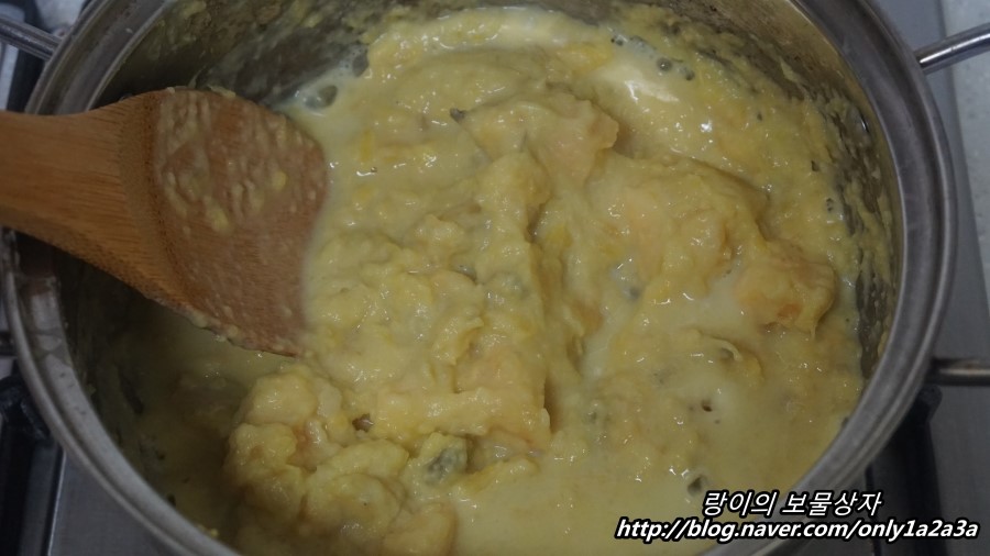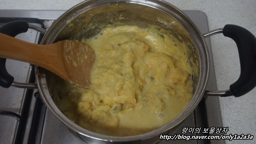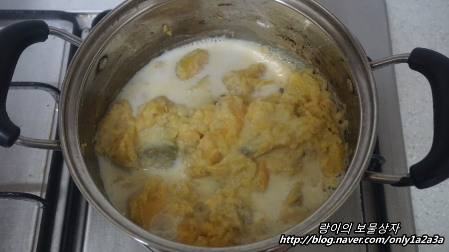으깬 고구마에 우유를 자박하게 넣고 끓여주세요