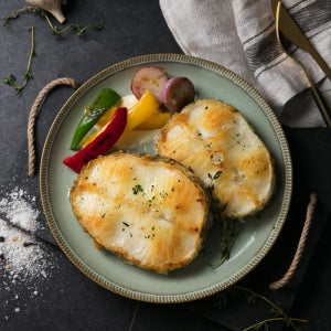 다 구워진 생선스테이크이지요. 아래쪽이 두툼하니 콩가루를 입혀 준 생선이고요. 윗쪽이 바로 밀가루를 입혀서 구워준 생선입니다. 흔하게 굽는 스타일이지요.