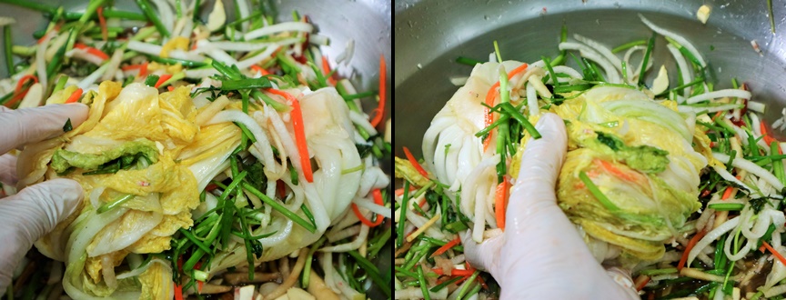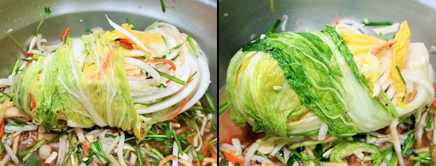 백김치 속을 골고루 넣어준 다음 가장자리 잎으로 감싸줍니다~!~