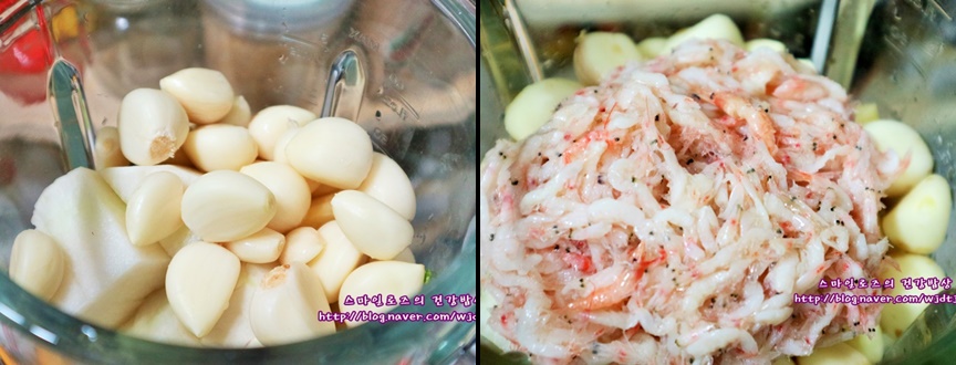 마늘 생강 양파 배와 사과 1/2개씩을 모두 믹서기에 넣어줍니다