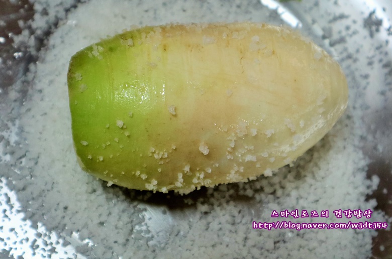 백김치 중간에 작은 무 3개를 소금에 굴려서 넣어주었어요~!~
