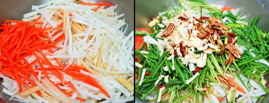 당근 배 사과 무 채 썰은 것에 밤과 대추 썰은 것을 섞어줍니다~!~