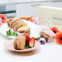 -다쿠아즈를 짜고 윗면에 슈가파우더를 바로 뿌릴 수 있도록 옆에 슈가파우더와 체를 대기시켜놓으세요.