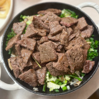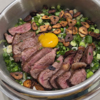 버섯을 넣은 영양솥밥에 육즙이 가득한 스테이크를 얹은 '스테이크 솥밥' 입니다 .