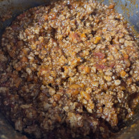 고기에서 육즙이 나오고 계속 볶으면 약간 바스라지는 식감이 될때까지 볶아주고 이때 소금과 후추, 각종 허브류를 첨가한다