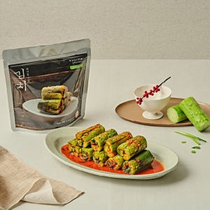 오이는 속을 파내고 알배추는 절인 후 깔끔한 김칫 국물을 부어 숙성시킨 여름 물김치인데요. 톡 쏘는 청량감이 있는 채선당식 오이물김치랍니다.