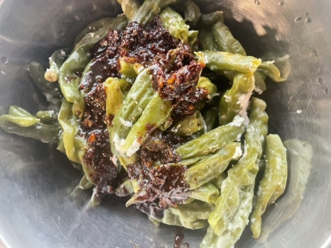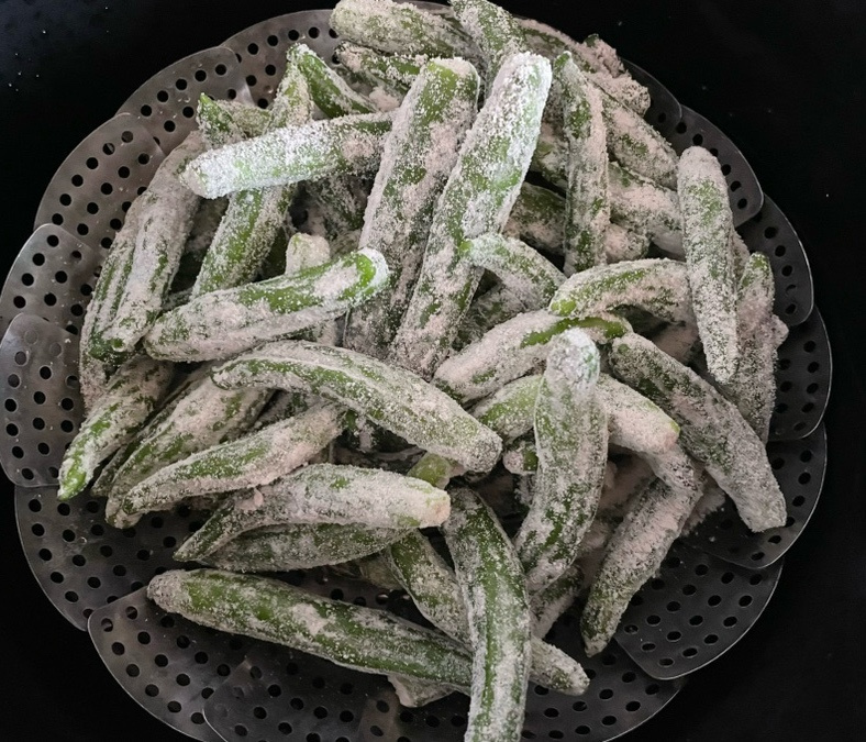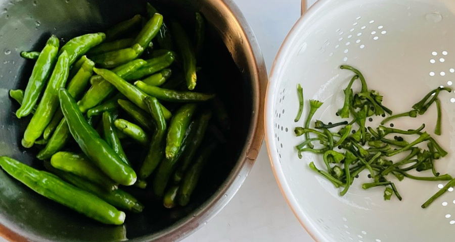 꽈리고추에 밀가루, 찹쌀가루, 또는 날콩가루 묻혀서 찜을 하는데옷을 입히는 재료에 따라 질감이나 맛도 약간은 달라져서 가끔 변화를 줘도 좋은 거 같아요.