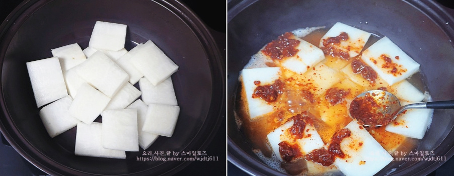 항상 생선조림할 때 무를 먼저 양념 일부를 넣고 반쯤 익혀줍니다