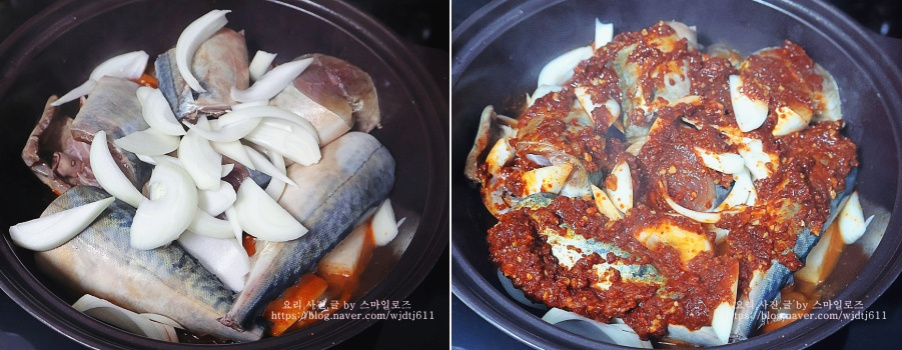 고등어를 올리고 양파도 올려준 다음 양념장을 골고루 올려줍니다