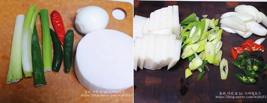 무는 도톰하게 자르고 대파는 어슷 썰고 양파도 굵게 채 썰어줍니다