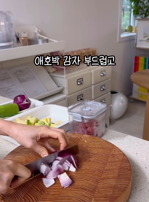 감자는 0.5cm 정도 두께로 썰고, 애호박은 1cm 정도 두께로 도톰하게 썰어주세요.