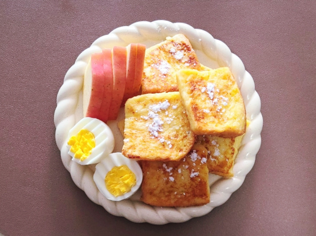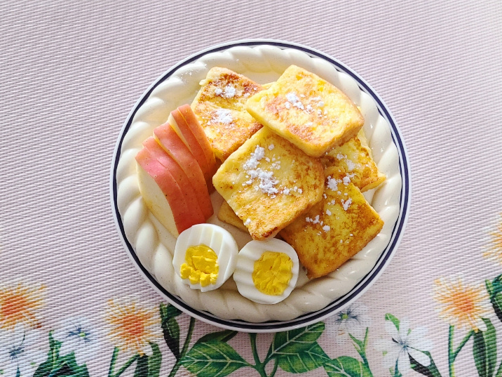 식빵을 조금 더 맛있게 먹고 싶을 땐 카페에서 먹는 것처럼 촉촉한 프렌치 토스트 레시피 방법으로 만들어 삶은 계란, 사과 한 조각까지 챙겨 먹으니 한 끼 식사로 든든하게 자~알 먹었어요.