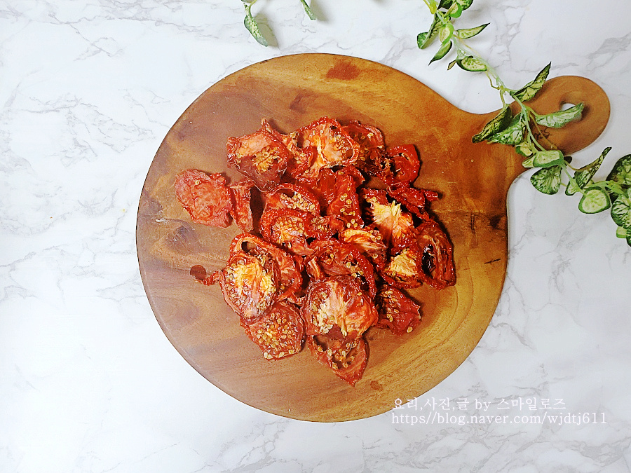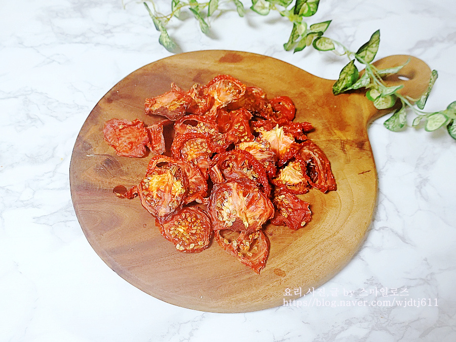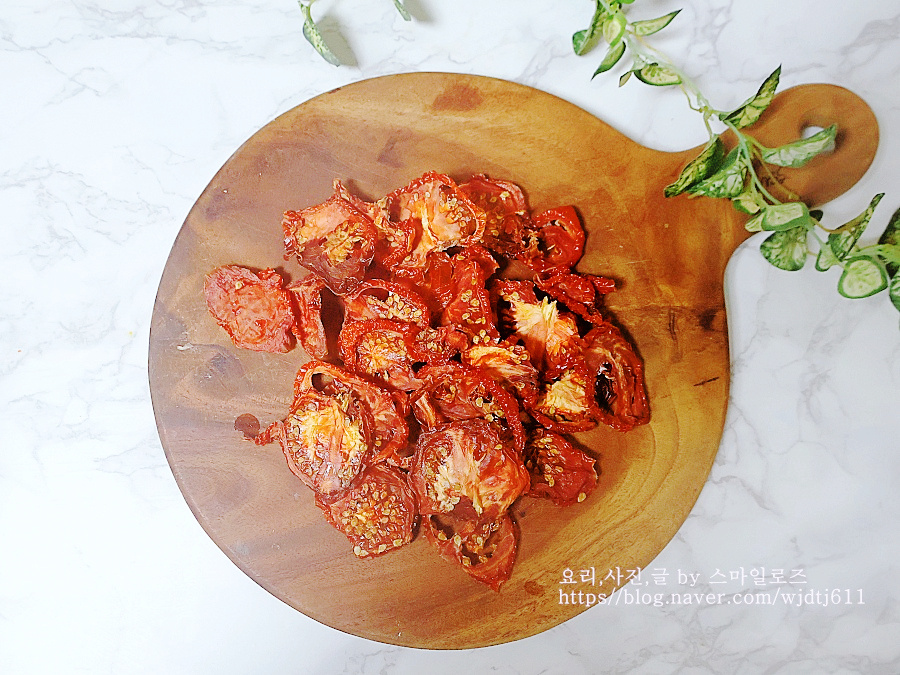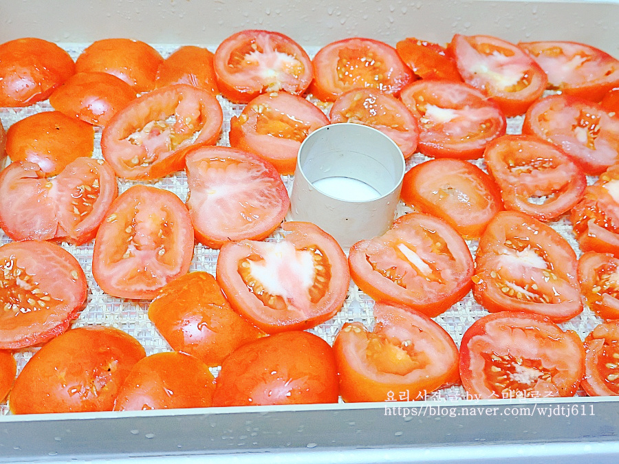 방울토마토나 큰 토마토를 반으로 잘라 소금 허브 등을 뿌려 햇볕에 말리는 방법이지만