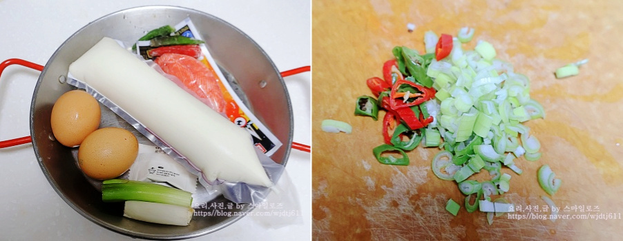대파는 반으로 길게 자른 뒤 송송 썰고 청양고추와 홍고추도 송송 썰어 놓았어요