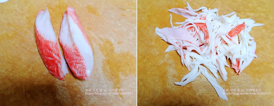 맛살은 손으로 쪽쪽 찢어 준비했어요