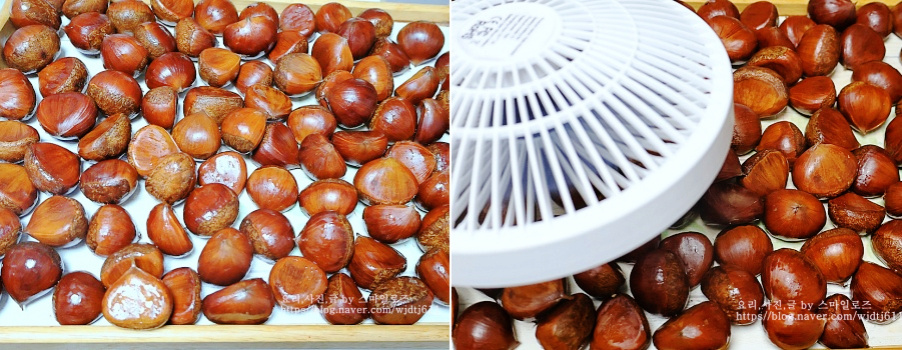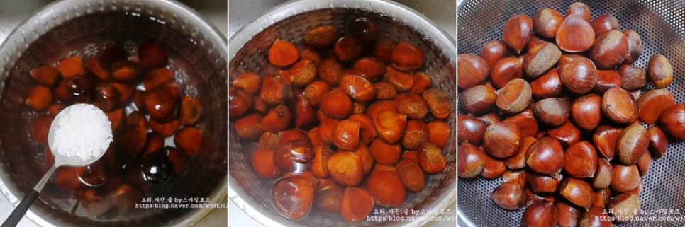 소금물에 씻은 후 김치냉장고에 보관해서 숙성을 한 다음 밤 삶기를 하면