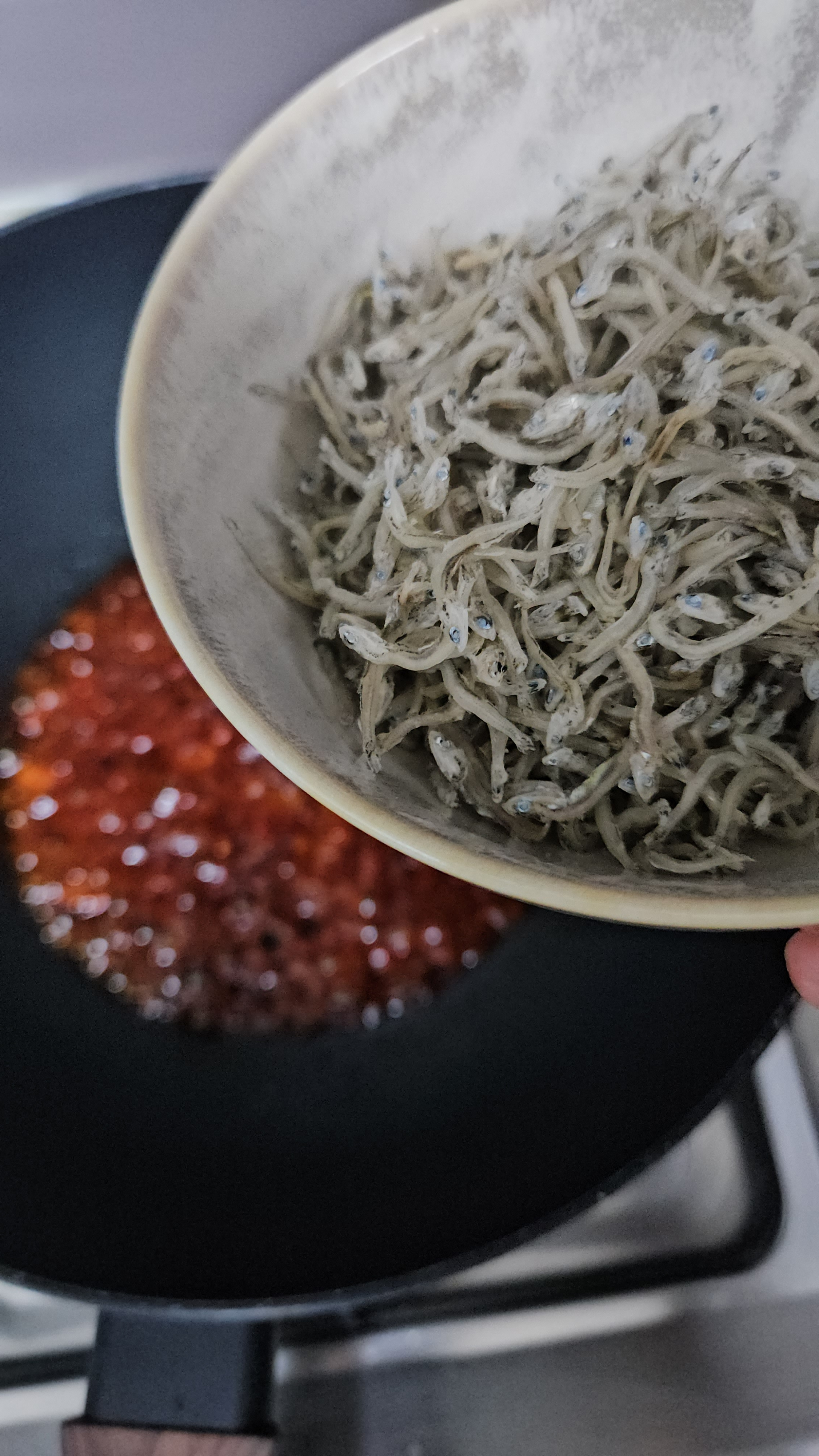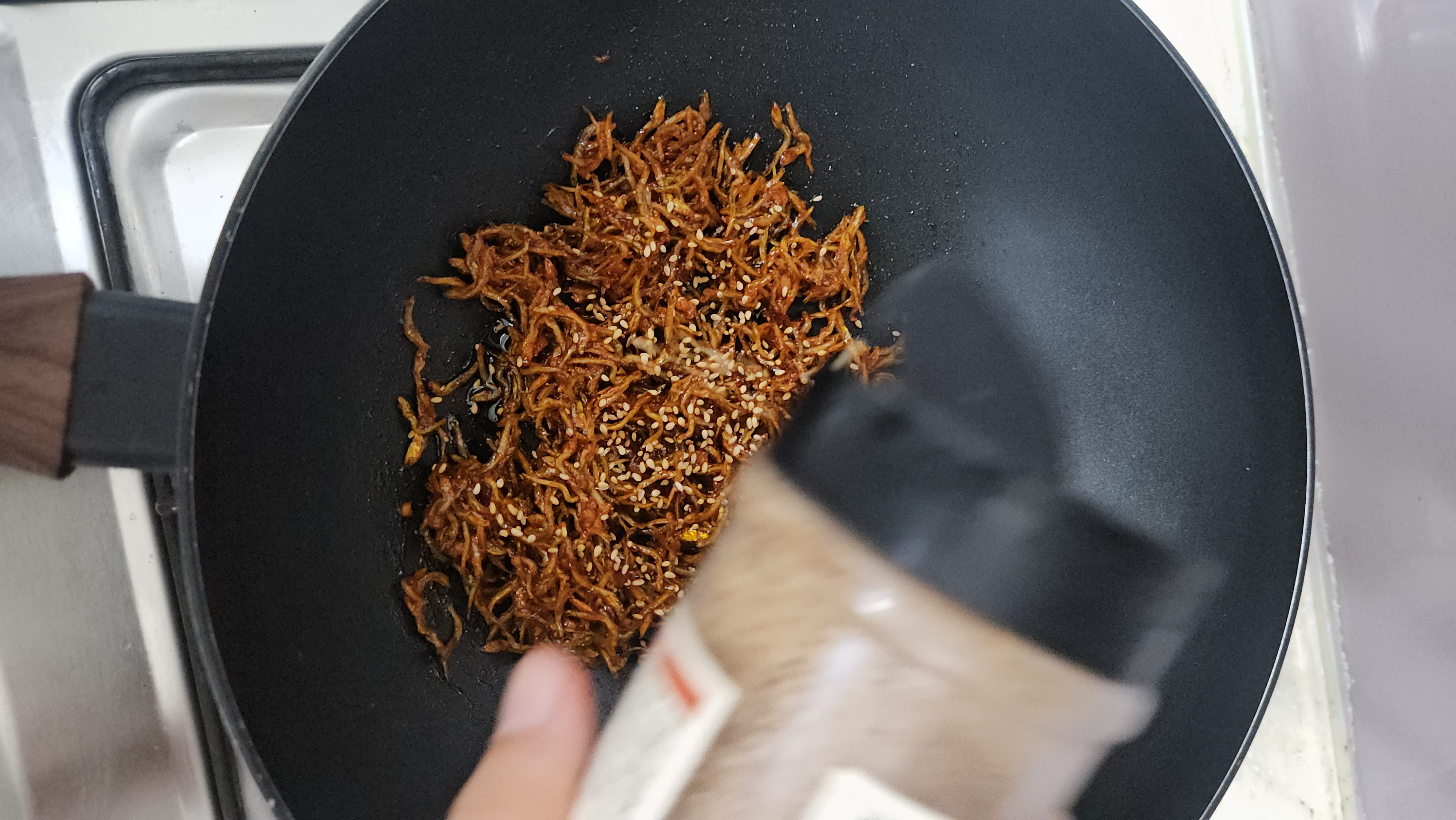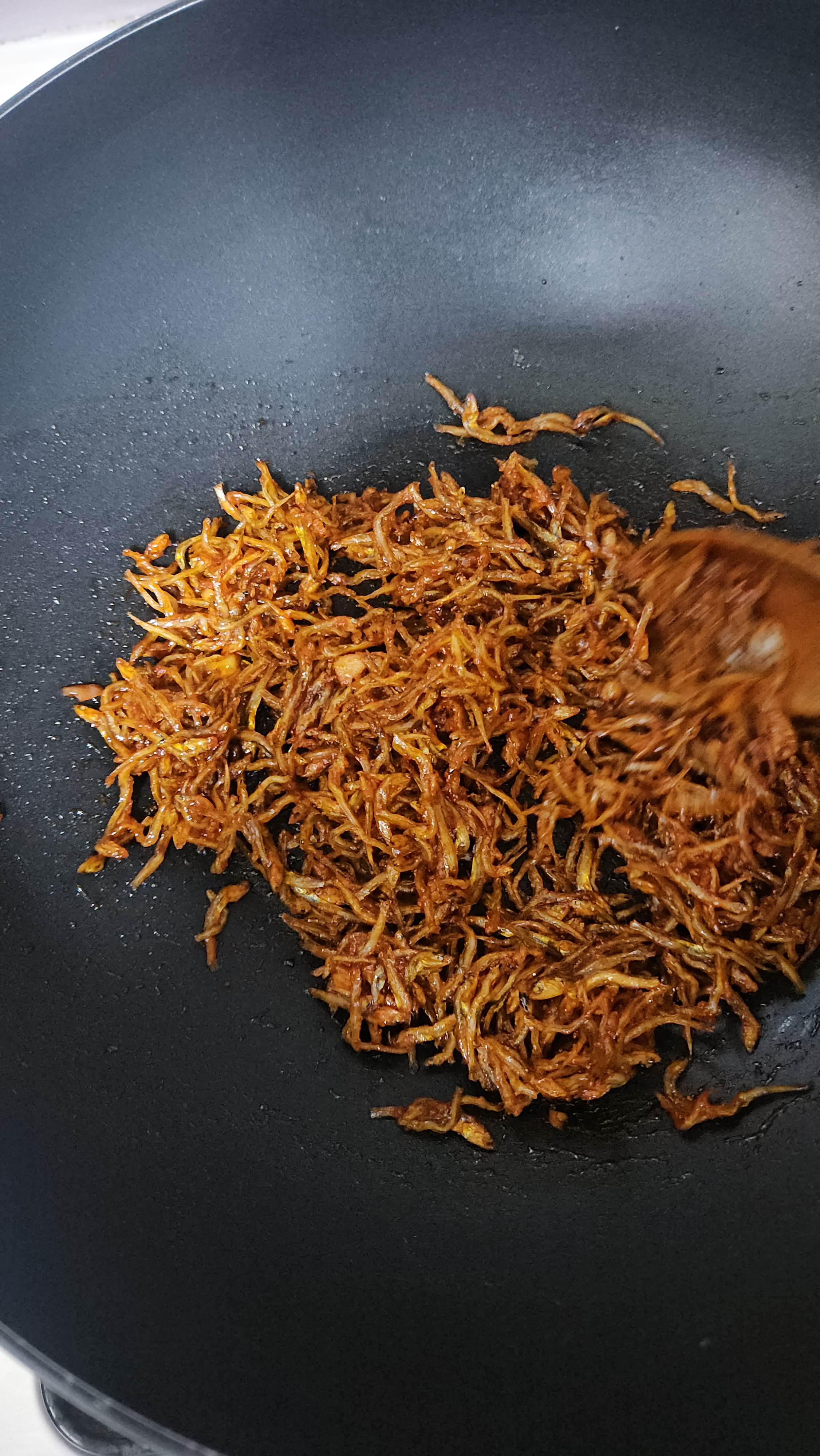 양념을 끓여주고 불을 끈 다음, 남은 열기에 멸치를 재빨리 섞어주어야 굳지 않고 잘 섞여요