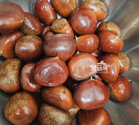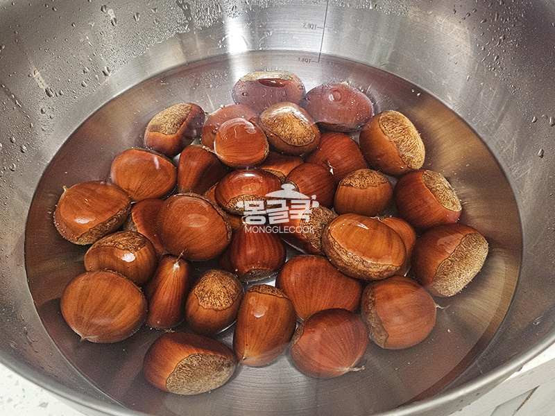 먼저 밤을 따뜻한 물에 약 30분~1시간 정도 담가 껍질을 부드럽게 만들어주세요.