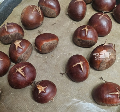 밤의 둥글고 볼록한 윗면 중앙에 십자(+)나 일자(-) 칼집을 깊게 내주세요.