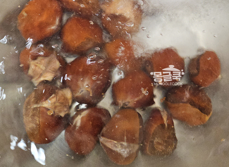 냄비에 물과 소금 1작은술을 넣고 끓인 뒤, 칼집 낸 밤을 넣고 2분 정도만 살짝 데쳐주세요.