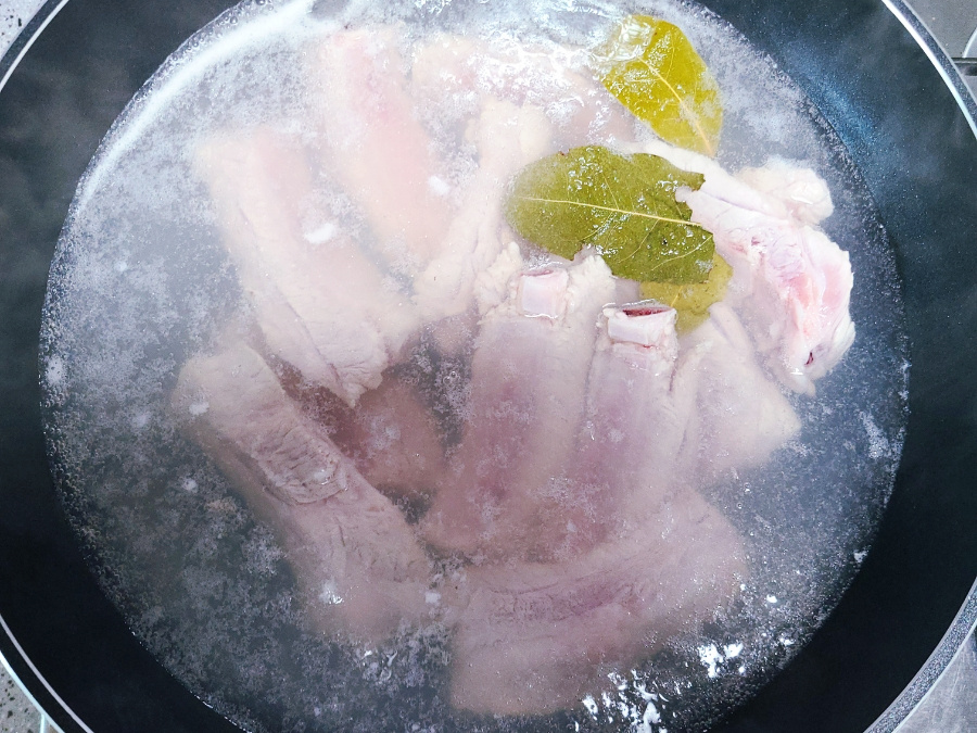 물이 끓어오르면 돼지 등갈비를 넣고 뒤적여준 다음에 다시 물이 끓어오르면 가스불을 살짝 줄이고 3분간 데쳐줍니다.