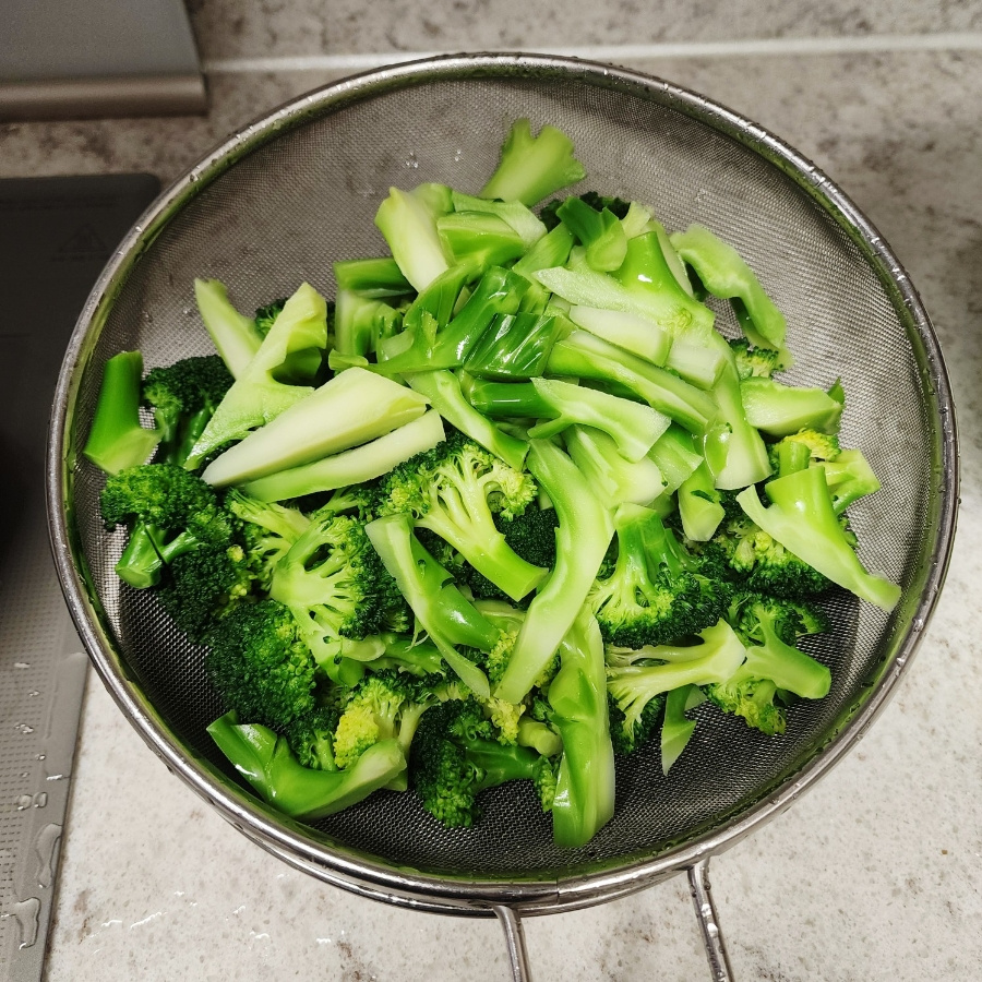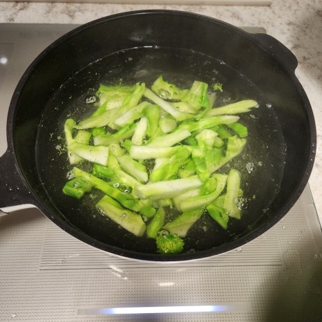 브로콜리 줄기 식감이 좋아서 전 줄기도 썰어서 같이 요리하는데 줄기는 2분에서 2분 30초 정도 삶아줘야 식감이 좋아요.
