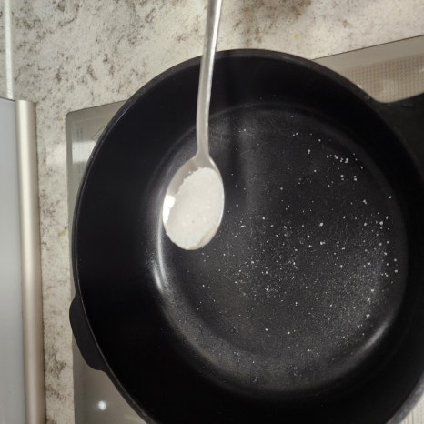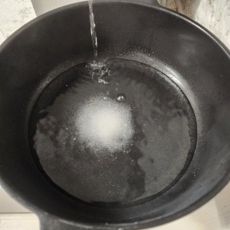 빠르게 요리하고 싶어 정수기 뜨거운 물을 냄비에 넉넉하게 받아 주는데 받을 때 소금을 2스푼 정도 넣고 물이 끓여주세요.