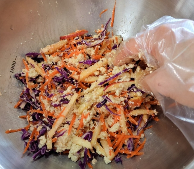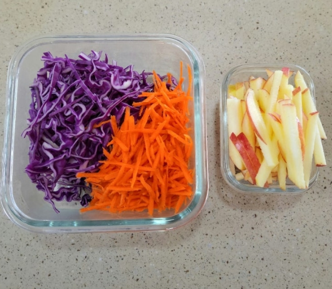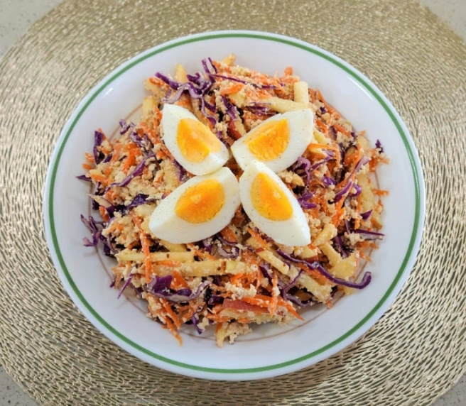 양배추, 당근, 사과 (cabbage, carrot, apple) 를 갈아서 먹는 일명 "까"주스~는 비타민, 항산화 성분이 풍부한 해독주스입니다. 하지만 갈지 않고 꼭꼭~ 씹어서 그냥 샐러드로 먹는 것도 추천할만 합니다. 두부로 만든 "순 비건 마요네즈"로 고소함과 상큼함을 더하고, 계란을 추가해서 한 끼 가벼운 식사로도 좋은 일명 " CCA 샐러드"입니다.