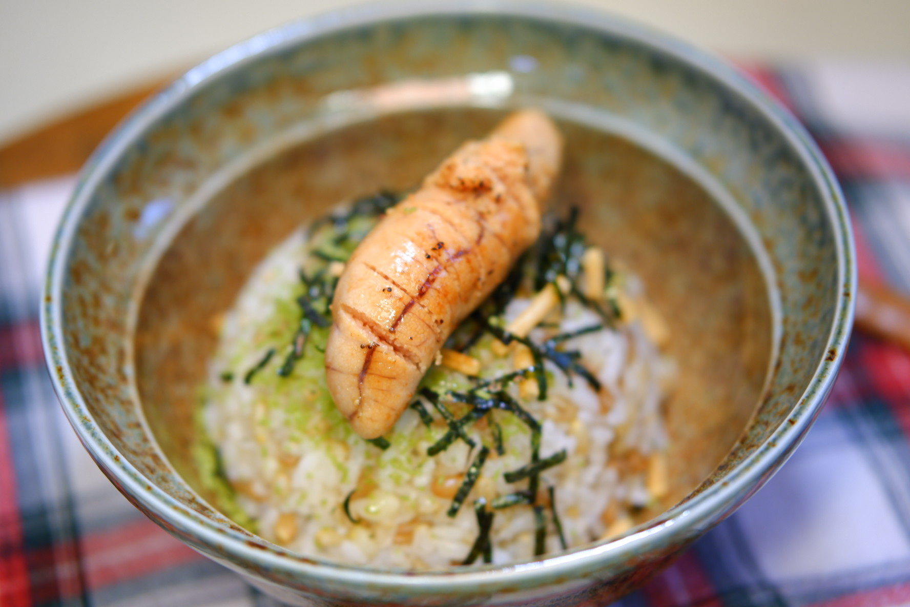 명란 1 개 , 버터 한쪽 , 나가타니엔오차츠케 1 봉지 , 쪽파 1 뿌리 , 녹차 티백 1 개