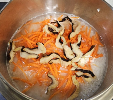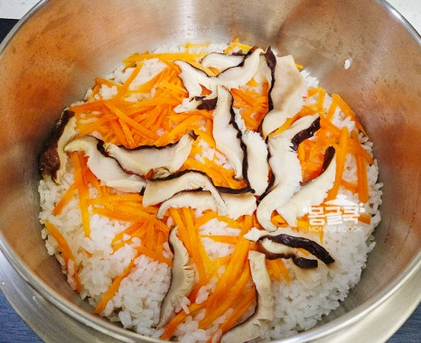 쌀 위에 당근과 표고버섯을 먼저 펼쳐 올려주세요.