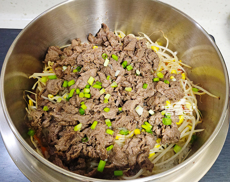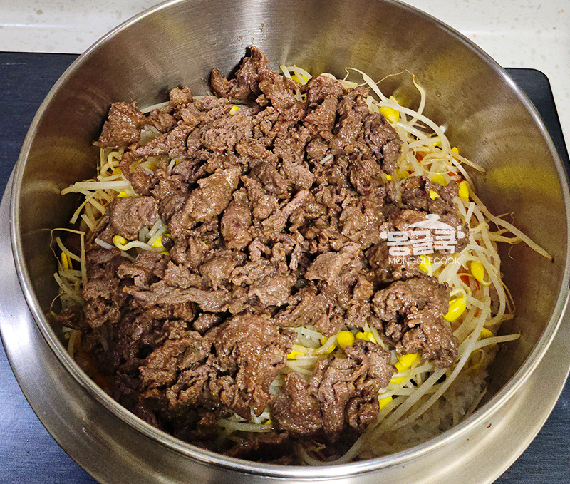 불을 끄고 준비해둔 볶은 소불고기를 밥 위에 얹어