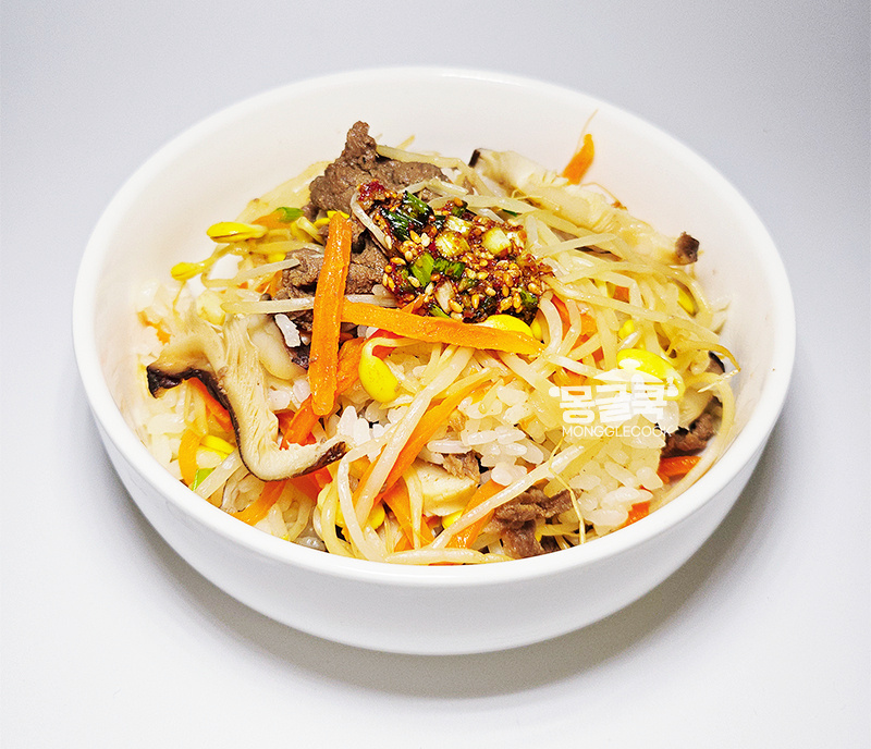 특히 콩나물과 표고버섯에서 자연스럽게 수분이 나오기 때문에 일반 밥 물보다 살짝 적게 잡는 것이 포인트랍니다.