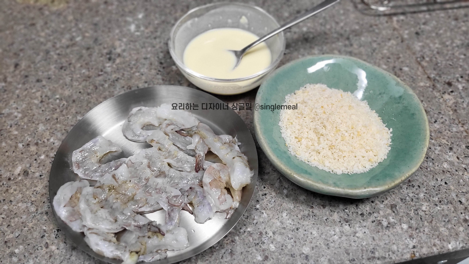 잘 손질한 새우는 꼬리만 남기고 껍질을 제거한 다음 튀김가루로 튀김옷을 만들어 입히고 빵가루를 묻혀줍니다.