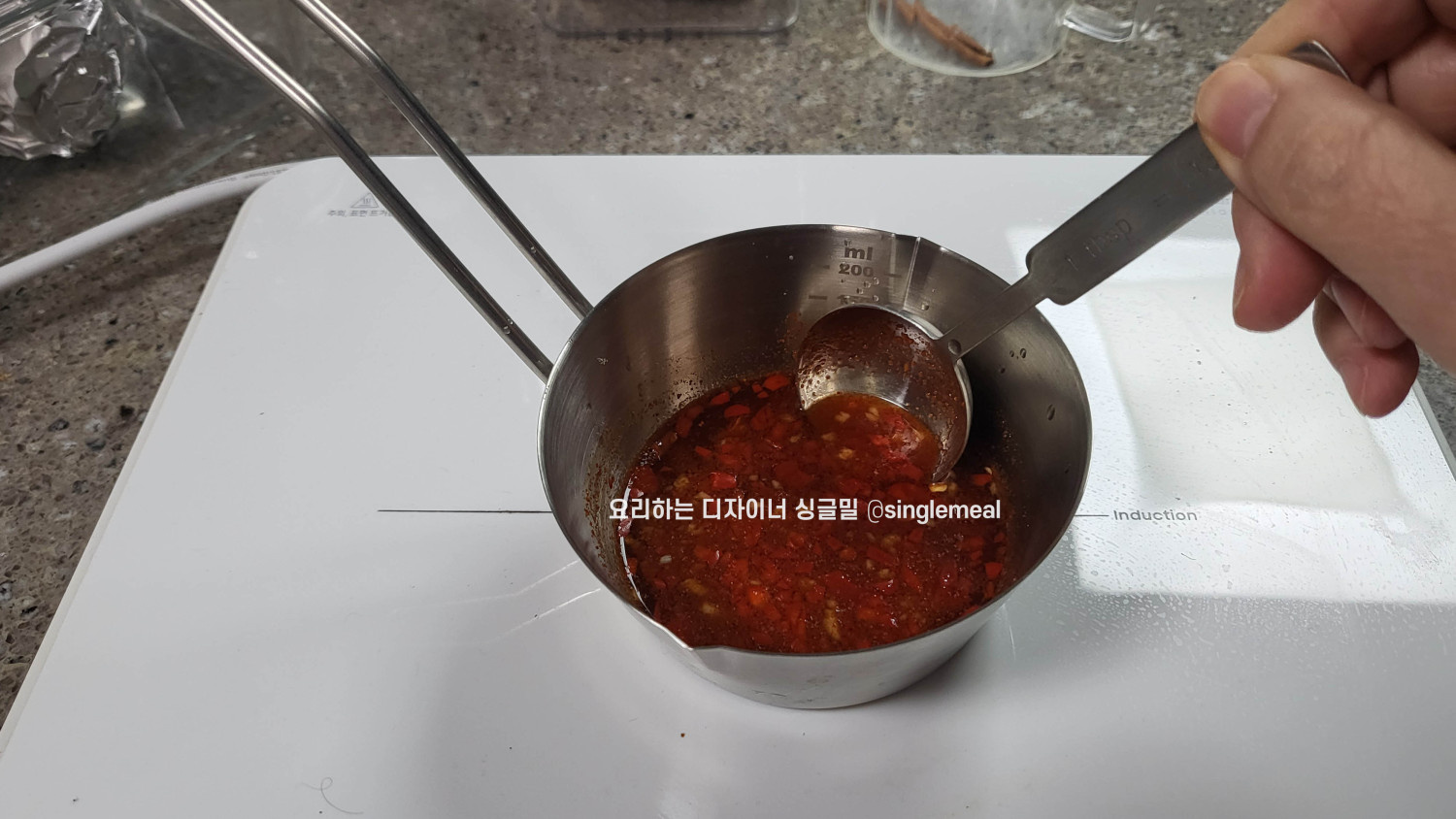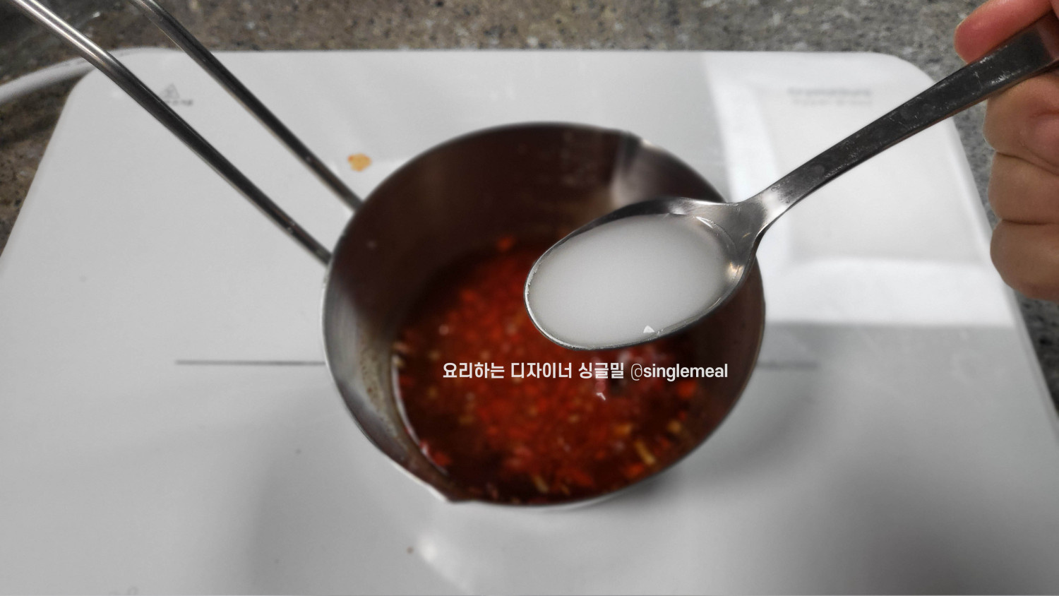 먼저 전분물을 제외한 분량의 소스 재료를 넣고 설탕이 녹이며 끓여 스위트칠리소스를 만들어줍니다.