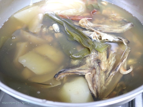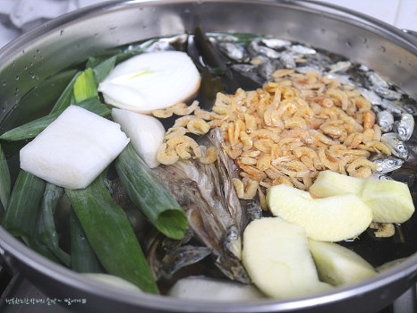황태대가리,건새우,멸치,무,다시마,양파,대파,사과