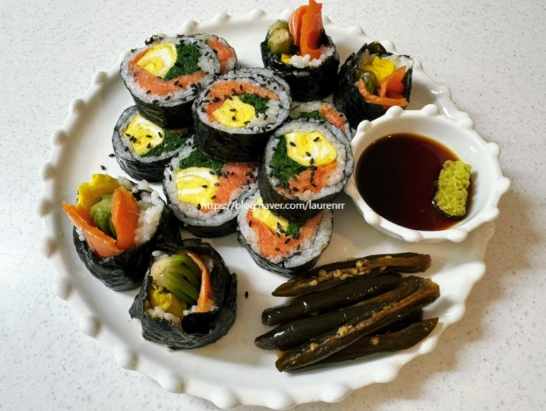 간장, 와사비 소스와 매콤한 할라피뇨 장아찌를 곁들어