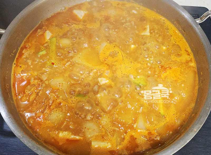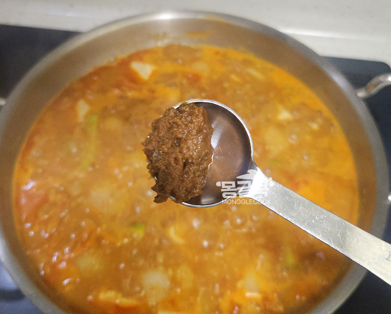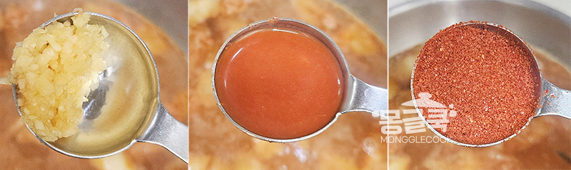 여기에 다진 마늘 0.5큰술, 고춧가루 0.5~1큰술, 김치 국물 1~2큰술을 넣고 한 번 더 끓여 주세요.